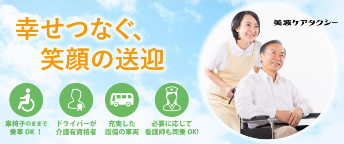 通院や日々のお買い物、外出や小旅行など、「行きたい」けれど「行けない」方々をサポートいたします。介護者と被介護者の負担や不安を軽減し、お互いの幸せをつなげる笑顔の送迎をいたします。 詳細は、美波ケアタクシーのホームページをご覧ください。